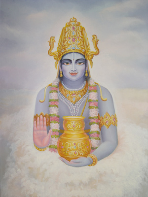 Дханвантари - врач богов, изображаемый в белой одежде, с чашей дарующего бессмертие напитка амрита.