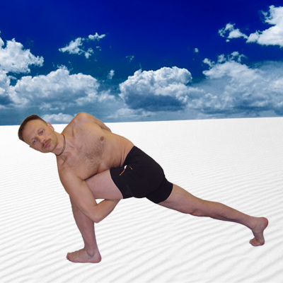 По трудности выполнения «Падмасана» («поза лотоса») имеет у Айенгара коэффициент «четыре», а «Паривритта Парсваконасана» - «девять», - уже одно это говорит о том, что поза отнюдь не являет собой, как говорил поэт, «лобзание русалки либо прогулку при луне». Начинать эту асану лучше встав для начала на пол, на какое-то одно колено, допустим, правое, и выполнив стандартный выпад левой ногой.