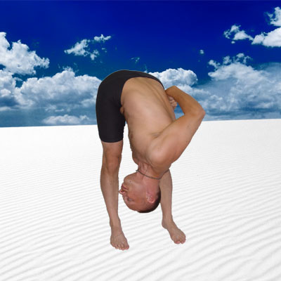 Выдохнуть, наклониться вперед и поместить пальцы на пол. Затем положить на пол и ладони по бокам от стоп, позади пяток. Ноги в коленях не сгибать.