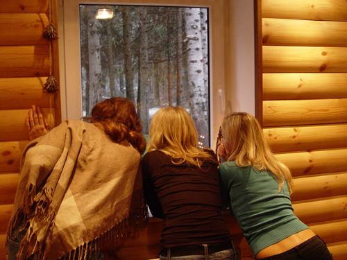 Олеся Погода радовала: сверху падала какая-то мокрая пакость, отдаленно напоминавшая снег. Мокрый деревянный настил и дохлые елки на заднем плане тоже как-то не слишком напоминали великолепие гималайских вершин, к которым мы бодро собирались готовиться. Однако скудость пейзажа и вопиющая невозможность похвастаться хотя бы пятнадцатью минутами, проведенными голышом на настоящем морозе, не остановила будущих туммоистов.
