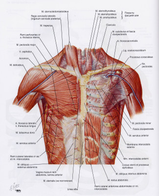 1) Большая и малая грудные мышцы. Большая г. м., начинаясь от внутренней части ключицы, грудины и рёберных хрящей, единым сухожилием заканчивается на плечевой кости. Малая г. м. лежит под большой и, начинаясь от 2, 3, 4 и 5 рёбер, заканчивается на клювовидном отростке лопатки. Обе мышцы при сокращении тянут плечи вперед и увеличивают грудной кифоз.