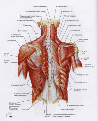 2) Мышцы межлопаточной зоны. Комбинированная группа, включающая в себя среднюю порцию трапециевидной мышцы и ромбовидные мышцы, при сокращении приводит лопатки к позвоночнику, отводит плечи назад и уменьшает грудной кифоз.