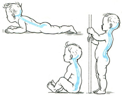 Человек рождается на свет в состоянии сплошного тотального кифоза; мышечная система при этом развита слабо, преобладает тонус сгибателей, из-за чего позвоночник представляет собой сплошную пологую дугу выпуклостью кзади. По наиболее принятым представлениям, первый физиологический изгиб позвоночника появляется примерно в возрасте 2 месяцев, когда ребенок начинает держать голову лёжа на животе – повышается тонус сгибателей позвоночника в области шеи и формируется шейный лордоз. В возрасте около 6 месяцев ребенок начинает сидеть и это приводит к формированию грудного кифоза. Наконец, в возрасте 10-12 месяцев ребенок начинает стоять и ходить — и для поддержания равновесия происходит формирование поясничного лордоза (по Tittel).