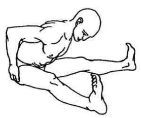 Из положения рис.3 подтянуть ступню правой ноги к промежности, взять ее руками и приподнять повыше, стараясь коснуться пяткой живота в области пупка. При этом необходимо иметь в виду: голень легко уходит внутрь, если нога ПОЛНОСТЬЮ согнута в колене. Если нога согнута не полностью, то чрезмерно усердные попытки вывернуть голень внутрь могут окончиться травмой.